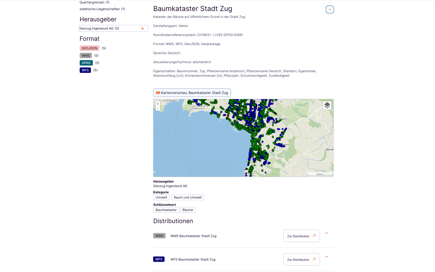 Die öffentliche Datenplattform des Kantons Zug stellt eine breite Sammlung an öffentlich zugänglichen Datensätzen zur Verfügung, die für jedermann nutzbar sind. Als Teil dieser Initiative leistet auch Geozug Ingenieure AG hier einen Beitrag, indem wir im Auftrag der Stadt Zug erste Datensätze der Kategorien Mobilität und Verkehr wie auch Raum und Umwelt zur Verfügung stellen. Diese beinhalten unter anderem die Verkehrsmeldungen, die städtischen Liegenschaften, die Quartiergrenzen, der Parkplatzkataster und der Baumkataster.