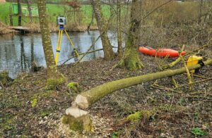 Aufgrund der anhaltenden Regenfälle in diesem Winter sank der Wasserspiegel nur sehr zögerlich, wobei die Flussprofilaufnahmen per Kajak nur bei geringer Strömung durchgeführt werden konnten. Erst als der Wasserspiegel im Februar endlich sank, konnten wir – ausgestattet mit Kajaks und einer Portion Abenteuerlust – die notwendigen Vermessungen durchführen. Neben den technischen Herausforderungen bot das Projekt auch naturnahe Erlebnisse, wie die beeindruckenden Spuren eines ortsansässigen Bibers.